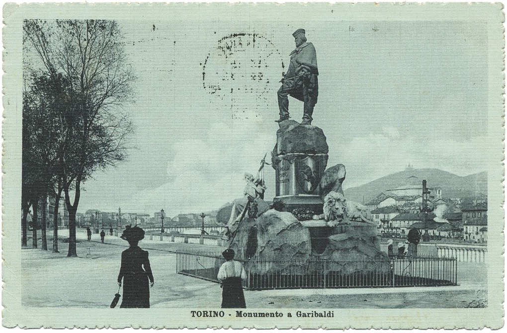 In corso Cairoli, a Torino, c’è il monumento di Garibaldi realizzato da Odoardo Tabacchi. L’eroe sta in piedi su un basamento di granito, in parte lavorato e in parte lasciato a grezzo. Indossa una mantella militare, pantaloni ampi e pesanti, un fazzoletto intorno al collo e il tipico berretto all’ungherese. La gamba destra è avanzata e poggia su una roccia, le mani reggono la spada infoderata. Lo sguardo è pensoso e rivolto verso il basso, verso un passante ideale che si fermi ad ammirare la sua massiccia figura.