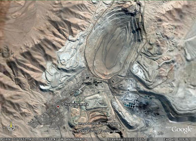 Per esempio di Chuquicamata, in Cile, e dell’enorme miniera di rame a cielo aperto che si trova nella regione dell’Atacama. Un’immensa voragine lunga 4,5 chilmetri, larga 2,5 e profonda più di mille metri. Vista da google earth appare così: