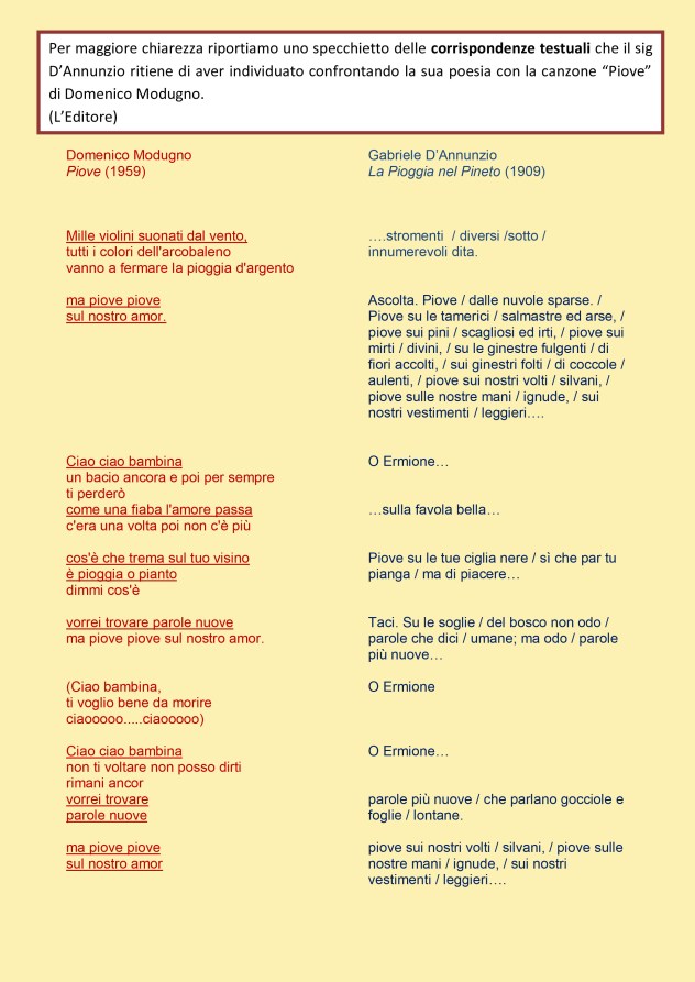 Costui scrisse e portò sul palco una canzonetta che, chiamandola “Piove”, già nel titolo riecheggia la mia poesia. Coincidenza? Non credo, se confrontiamo con attenzione i due testi.