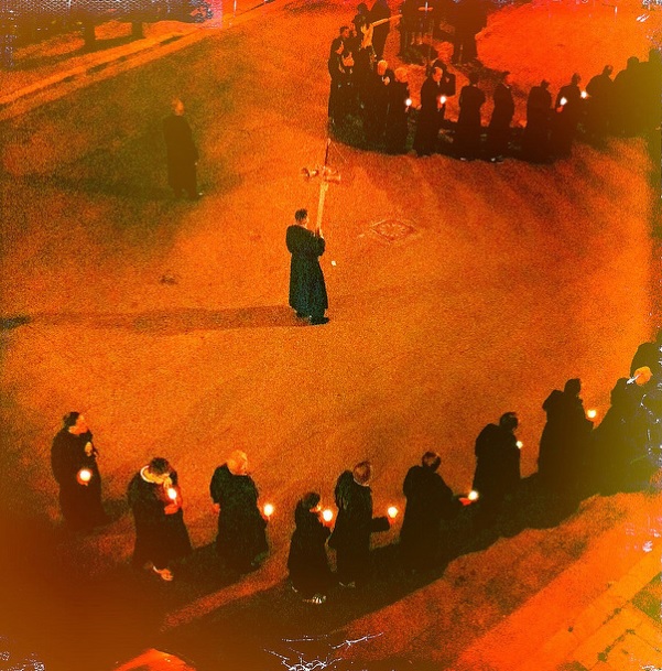 Un anno, in quel paese in provincia di Chieti, la statua del santo patrono protettore dei terremoti sant’Emidio s’è rotta, e siccome metteva paura ai bambini – avendo il cranio fracassato sull’osso occipitale e avendo perso anche le braccia e un piede -, al posto suo sull’altarino hanno fatto sfilare un maiale arrostito. Pare che le offerte di quell’anno hanno battuto il record di offerte raggiunto l’anno prima, quando invece era successo un altro fatto strano, cioè: quello addetto a portare il crocefisso, che, in un certo senso, guida tutta la processione, s’era perso per un vicolo, e la processione anziché seguirlo aveva preso la strada di quello con l’altoparlante, dal quale vengono fuori le voci in preghiera delle suore, e verso il quale però non erano comunque mancati né i segni della croce né le fotografie.